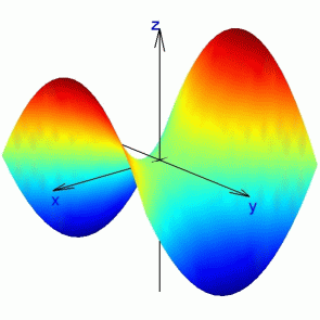 Let's look at this surface a little differently. In particular, when the domain for f(x,y) = x2y2 is the unit circle instead of the square. When we cut this surface with planes that contain the z-axis, we obtain parabolas that open upward and downward depending on the plane. What is the shape of the surface when the plane cuts the xy-plane in the lines y = x or y = x?