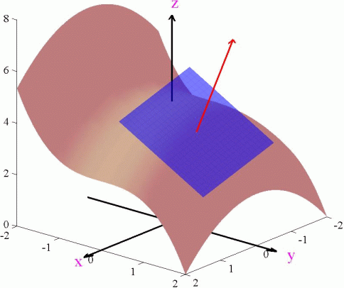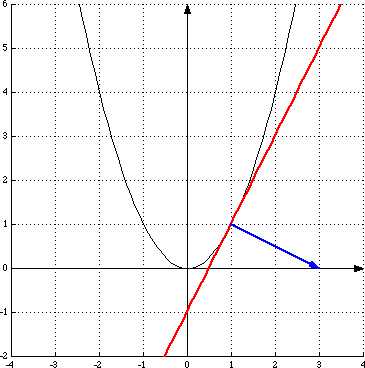 Consider the vector n = < f '(a), 1>. For the function f(x) = x2 at the point a = 1. We have f '(x) = 2x so the tangent line is given by 2(x 1) (y 1) = 0 or y = 2x 1 and the vector n is < 2, -1 >. Below is the graph of y = x2, the tangent line, and the vector n drawn at the point (1, 1).